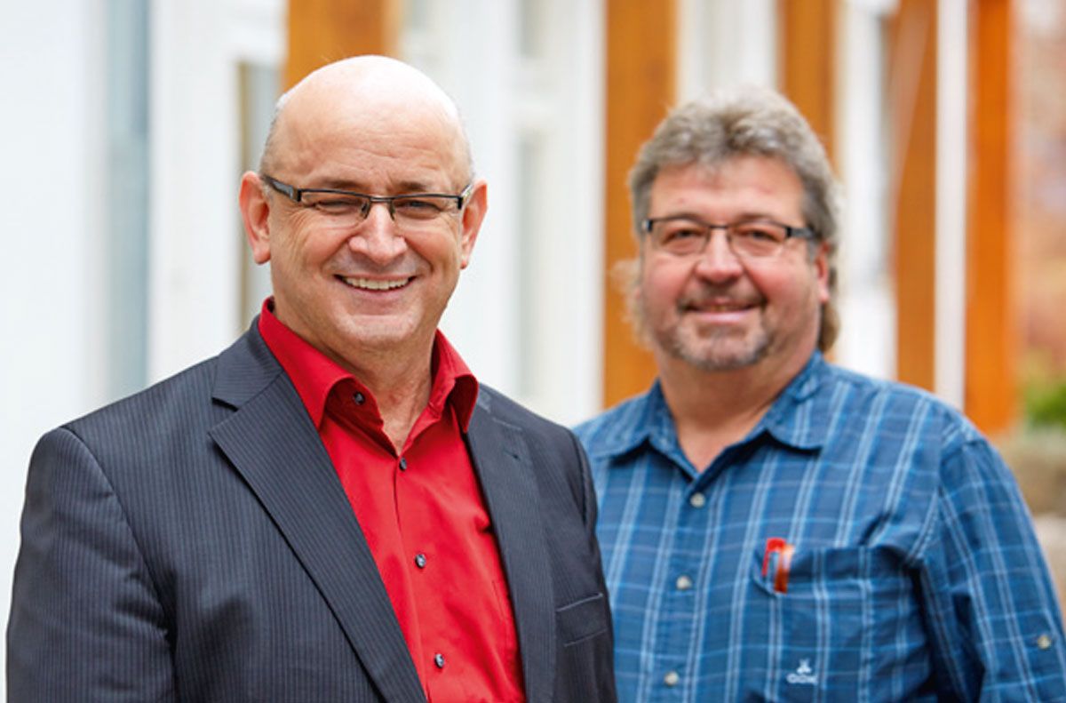 Walter Baschnagel, Head of Process Organization, IT and Quality Management (left), and Ralf Bausch, Head of the Mechanical Production Department, have a sheet metal storage system that is tailored to their limited space.